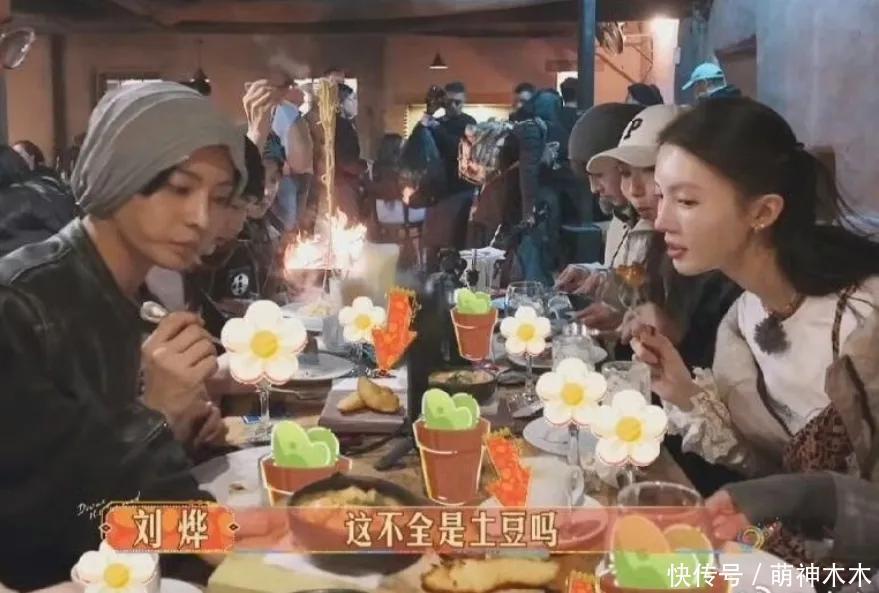 节目中,大家齐聚餐厅用餐,画面中,餐桌上摆满的不是菜品,而是各种后期打码用的贴纸,要么是白色小花,要么是盆栽,唯一幸存、没被打码的是土豆,它的普遍让它得以出镜。