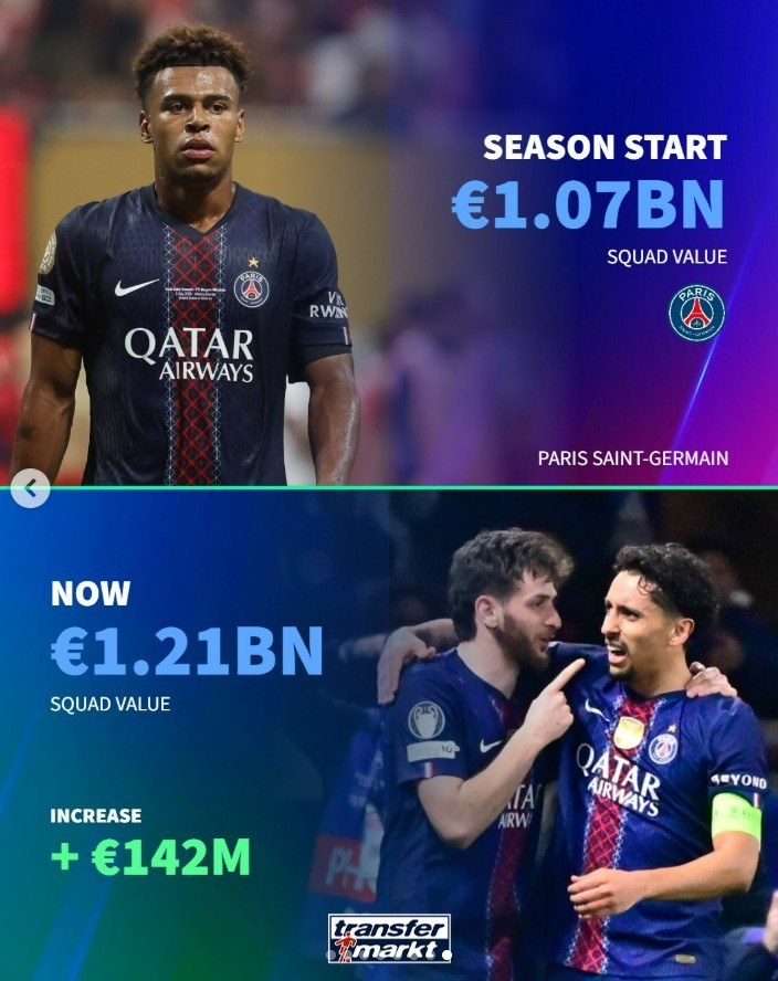 直播吧4月26日讯德转盘点了在本赛季身价上涨最多的几支球队,其中巴黎、科莫、考文垂在列,具体如下(赛季开始身价→目前身价):